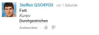 Neue Funktionen gibt es auch bei der Gestaltung von Kommentaren. Wörter in Kommentaren können jetzt fett, kursiv und durchgestrichen dargestellt werden. Für die jeweilige Formatierung müssen folgende Zeichen vor das jeweilige Wort geschrieben werden: