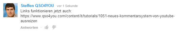 Das Posten von Links ist jetzt ebenfalls gestattet. Die Funktion kommt vielen YouTube Gurus zu gute, die oftmals auf Forenbeiträge oder ähnliches verweisen möchten. So können Tipps direkt per Kommentarantwort weitergegeben werden. Auf der anderen Seite, kann diese Funktion auch zu einen großen Problem werden, denn YouTuber mussen jetzt noch mehr auf Kommentare unter ihren Videos achten und ggf. einschreiten. Wie sehr gespamt wird, werden wir in den nächsten Wochen und Monaten sehen.