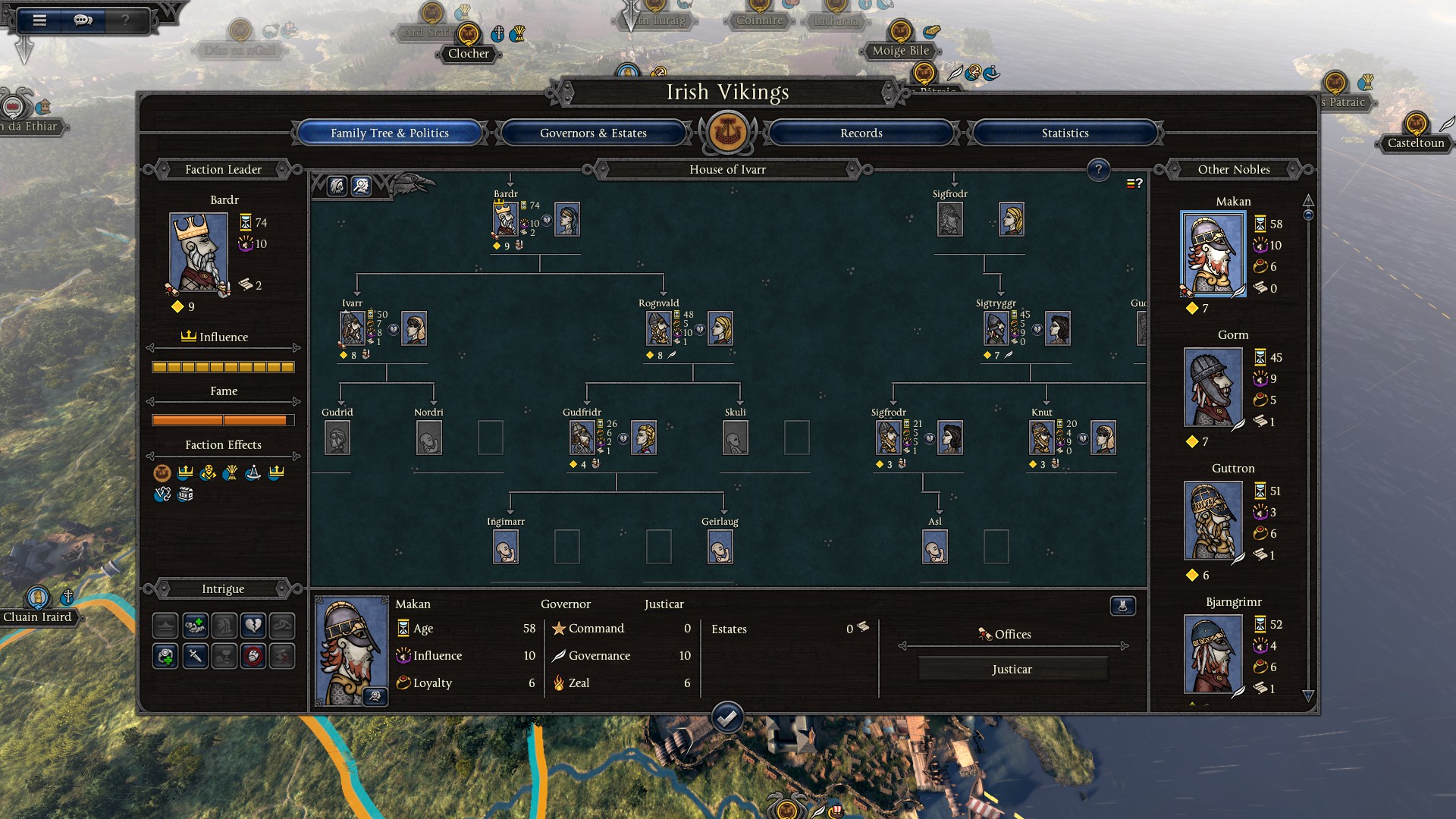 Innenpolitik und familiäre Angelegenheiten sind ähnlich wie bereits in Total War: Attila implementiert und dienen insbesondere bei größeren Reichen als ausbalancierender Punkt, da man auf immer mehr Charaktere wie Generäle und Gouverneure achten muss. Unter anderem auf ihre Loyalität zu einem selbst und darauf, dass ihr Einfluss möglichst nicht den des Königs übersteigt. Andere Spiele wie zum Beispiel Crusader Kings 2 gehen an dieser Stelle wesentlich tiefer aber für ein Spiel der Total War Reihe verfügt Thrones of Britannia über vergleichsweise tiefgehende Innenpolitik. Dazu gehören auch mögliche Ereignisketten bei innenpolitischen Aktionen wie zum Beispiel Adelige die über dutzende Runden hinweg gegen einen arbeiten und die damit einhergehende Bildung von Rivalitäten. Diese innenpolitischen Gegenspieler können bei einem großen Reich einen unachtsamen Herrscher, der nicht über absolute Kontrolle verfügt schnell mal aus der Bahn werfen.