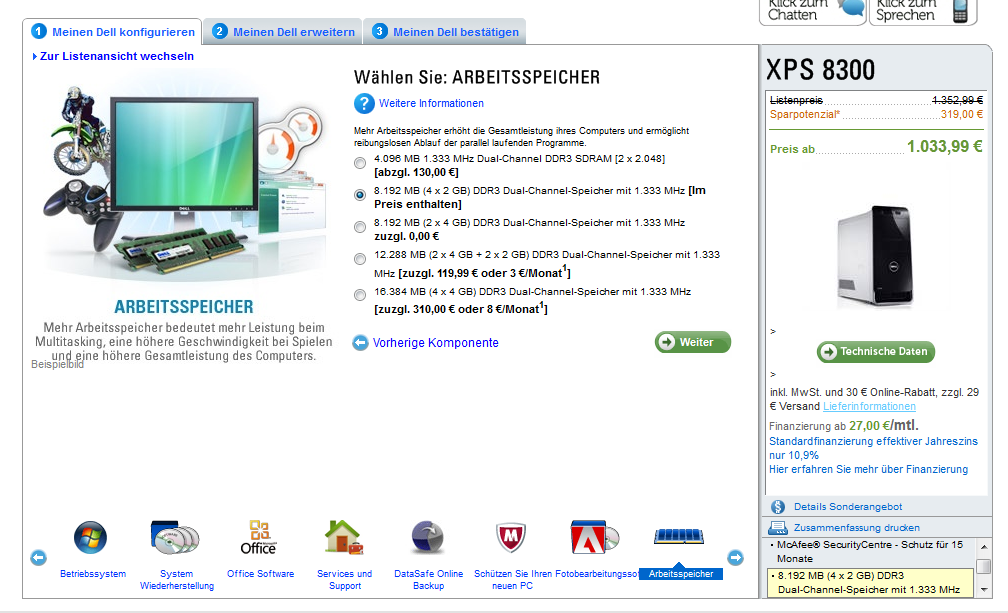 8 GB sollte eigentlich bei neuen PCs Standard sein. Außerdem würde ich mir die Recoverys auf DVD mitschicken lassen kostet auch nur 5 Euronen mehr.